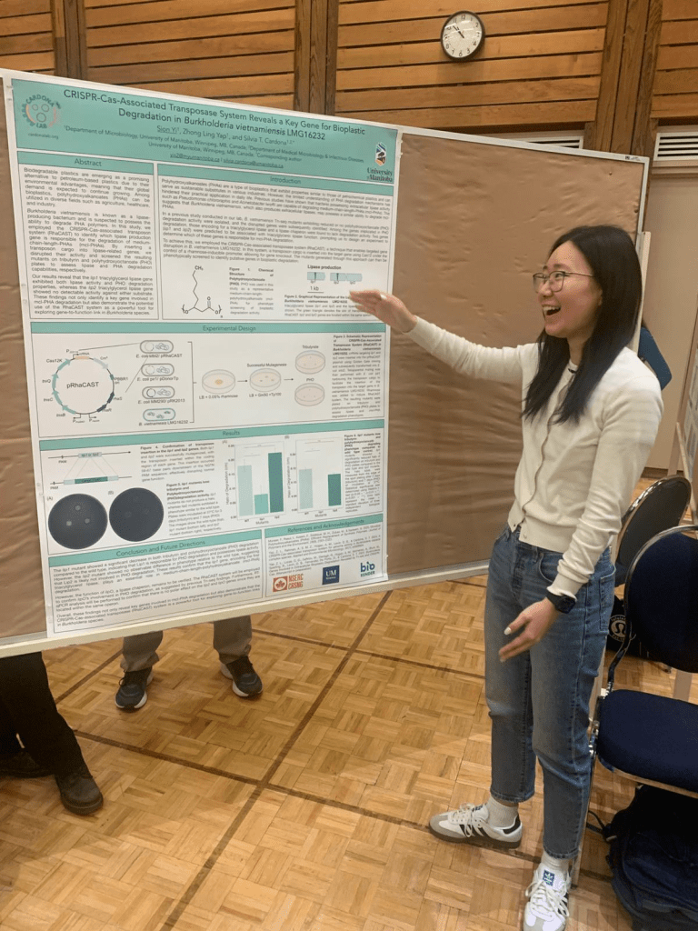 Congratulations to Sion Yi who presented at the 2025 Undergraduate Research Showcase at the University of Manitoba. Sion brought to our lab the 1st prize in the Natural Science poster presentation category for her work: CRISPR-Associated Transposase Reveals a Key Gene for Bioplastic Degradation in Burkholderia vietnamiensis LMG16232 in collaboration with Dr. Zhong Ling Yap and authors. more info here